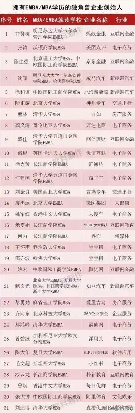 哪些獨(dú)角獸企業(yè)創(chuàng)始人擁有EMBA/MBA學(xué)歷? 文  /MBA招生網(wǎng)2019-02-28 15:54:51