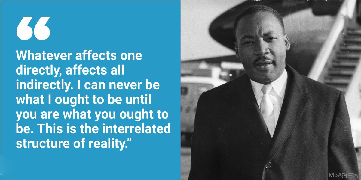 “任何直接影響一個人的,都會間接地影響所有人。我不可能成為我應(yīng)該成為的人,除非你是你應(yīng)該成為的人。這是現(xiàn)實(shí)的相互關(guān)聯(lián)的結(jié)構(gòu)。”《伯明翰獄中的來信》馬丁·路德·金
