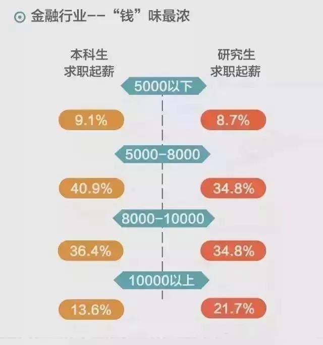 分析:金融專業(yè)本科和碩士的起薪都在5000-10000之間,本碩學歷對這個行業(yè)薪資的影響似乎并不是很大。因此,金融專業(yè)薪資可能更看重其他方面的差別而不是本碩的差別,讀研在某種程度上來說確實不能帶來薪資的巨幅提高。