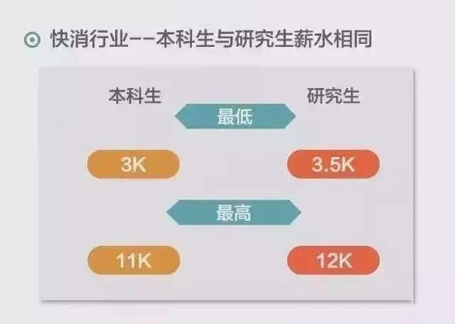 分析:快消行業(yè)本科生和碩士薪資基本相同,讀研并不能帶來起薪上的顯著提高。因此,快消行業(yè)的同學們如果單純只是為了提高工薪,還是盡量放棄考研的想法吧,踏踏實實找工作才是最重要的。