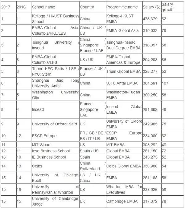 近期,英國《金融時報》公布2017年全球EMBA排名,據(jù)2016年數(shù)據(jù)統(tǒng)計表明報讀EMBA前男女平均薪資分別是11.1萬美元和12.8萬美元,而報讀EMBA畢業(yè)之后平均薪酬要上漲6萬美元!
