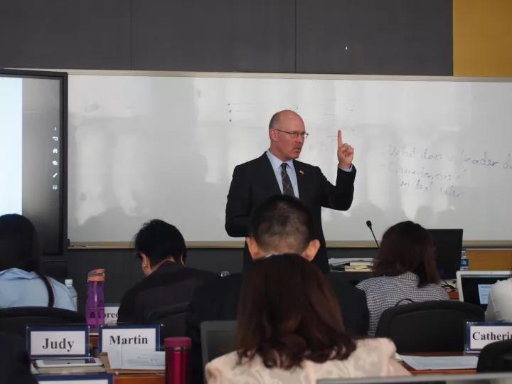 開(kāi)學(xué)典禮期間,同學(xué)們也進(jìn)行了第一次課程的學(xué)習(xí)。本次課程由加拿大西三一MBA項(xiàng)目主任Murray MacTavish教授為大家講授Leadership & Ethics。領(lǐng)導(dǎo)是一個(gè)影響他人和促進(jìn)他們共同努力實(shí)現(xiàn)共同目標(biāo)的過(guò)程。要做到這一點(diǎn),領(lǐng)導(dǎo)者必須具備知識(shí)、技能、智慧和判斷力。本次課程Murray教授通過(guò)閱讀、案例研究、作業(yè)、小組討論和團(tuán)隊(duì)建設(shè)活動(dòng),以及領(lǐng)導(dǎo)風(fēng)格和技巧不同的自我評(píng)估、自我反省和來(lái)自他人的反饋,幫助學(xué)生發(fā)現(xiàn)自己的領(lǐng)導(dǎo)潛力和為學(xué)生成長(zhǎng)奠定堅(jiān)實(shí)的基礎(chǔ)。本次課程教學(xué)模式多元化,氣氛輕松又不失嚴(yán)謹(jǐn),給同學(xué)們一個(gè)不一樣的教學(xué)體驗(yàn),受益匪淺,讓同學(xué)更加期待未來(lái)國(guó)際MBA的學(xué)習(xí)。