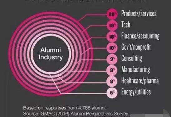 產(chǎn)品/服務(wù)、技術(shù)、金融/會(huì)計(jì)是三大熱門(mén)行業(yè),但并沒(méi)有出現(xiàn)一邊倒的行業(yè)井噴現(xiàn)象,即使最熱的產(chǎn)品/服務(wù)行業(yè)供職的比例也不超過(guò)20%;政府/非營(yíng)利組織、咨詢(xún)、制造業(yè)、保健/醫(yī)藥、能源/公共事業(yè)五大行的校友則各自穩(wěn)定在5%-10%。