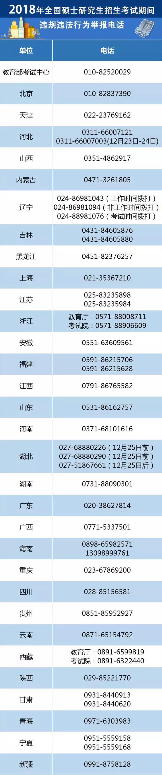 2018年全國碩士研究生招生考試將于2017年12月23日-25日舉行。為嚴(yán)厲打擊涉考違法活動(dòng),嚴(yán)肅考試紀(jì)律,維護(hù)考生合法權(quán)益,確??荚嚬焦?,教育部公布2018年全國碩士研究生招生考試期間違規(guī)違法行為舉報(bào)電話。