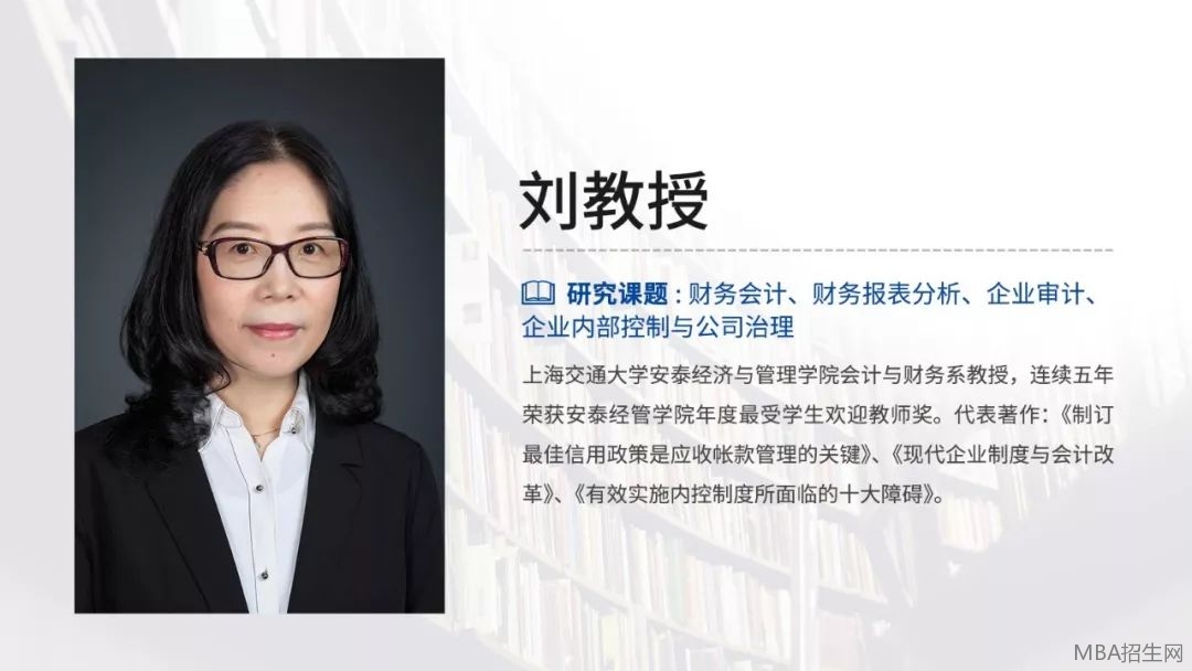 上海交通大學(xué)安泰經(jīng)濟與管理學(xué)院EMBA和EDP課程教授,兼任多家大中型企業(yè)的公司財務(wù)顧問及獨立董事。 長期執(zhí)教EMBA,EDP《財務(wù)會計與決策》、《財務(wù)報表分析》和《決策中財務(wù)管理》等課程,并連續(xù)多年獲得了上海交通大學(xué)安泰經(jīng)濟與管理學(xué)院最受歡迎的MBA課程教授、最受歡迎的會計報表分析課程教授。