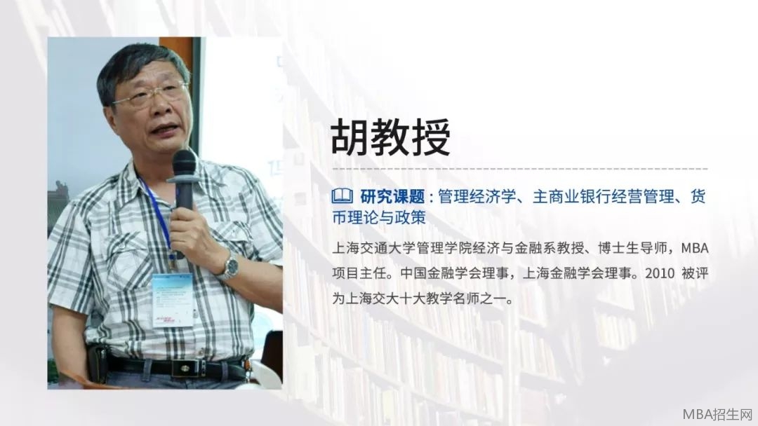 上海交通大學(xué)MBA教授,交通大學(xué)安泰管理學(xué)院經(jīng)濟(jì)與金融系教授、博士生導(dǎo)師、經(jīng)濟(jì)學(xué)博士,1999年胡教授當(dāng)選為上海市金融學(xué)會(huì)第四屆理事會(huì)理事,貨幣理論和貨幣政策研究專(zhuān)業(yè)委員會(huì)副主任,被評(píng)為年度最受學(xué)員歡迎的教授之一。主要研究方向:管理經(jīng)濟(jì)學(xué)、貨幣理論與政策等。