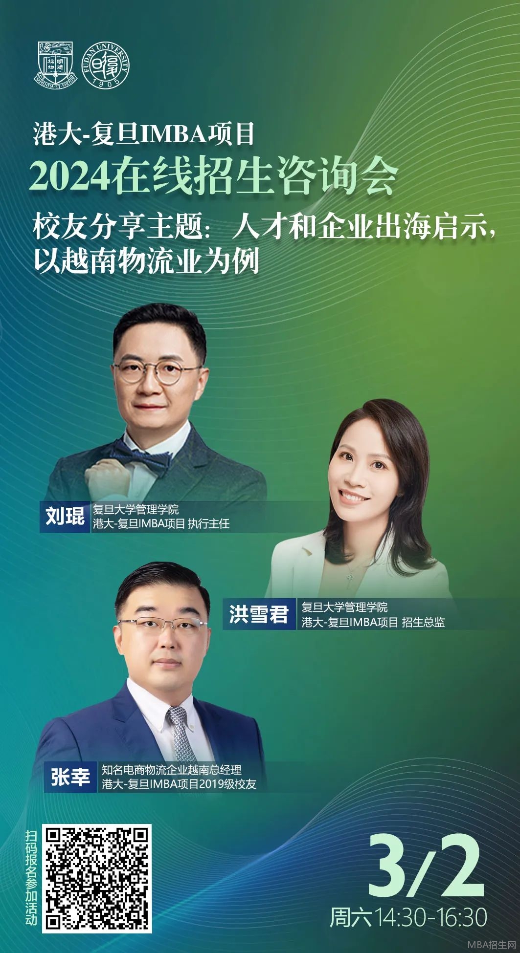 本次在線招生咨詢會(huì),港大-復(fù)旦IMBA項(xiàng)目執(zhí)行主任劉琨老師和招生總監(jiān)洪雪君老師會(huì)詳細(xì)介紹項(xiàng)目2024招生政策以及項(xiàng)目最新進(jìn)展。隨后港大-復(fù)旦IMBA項(xiàng)目2019級(jí)校友、知名電商物流企業(yè)越南總經(jīng)理張幸也將在越南遠(yuǎn)程連線,與我們分享他對(duì)于人才和企業(yè)出海的思考。最后Q&A環(huán)節(jié),我們會(huì)為大家一一解答關(guān)于項(xiàng)目報(bào)考流程及相關(guān)招生政策的疑問(wèn)。想在2024年9月入學(xué)的同學(xué)可要抓緊機(jī)會(huì)啦!歡迎對(duì)項(xiàng)目感興趣的各界人士報(bào)名聆聽分享。