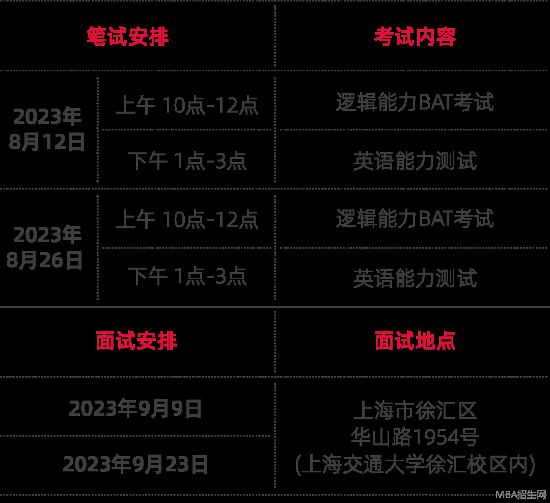 上海交大-KEDGE國(guó)際在職MBA項(xiàng)目組將于2023年8、9月份舉行本項(xiàng)目2023年度報(bào)名截止之前的倒數(shù)第二批筆、面試工作。請(qǐng)有報(bào)名計(jì)劃的同學(xué),抓緊報(bào)名,合理規(guī)劃本年度的學(xué)習(xí)計(jì)劃。