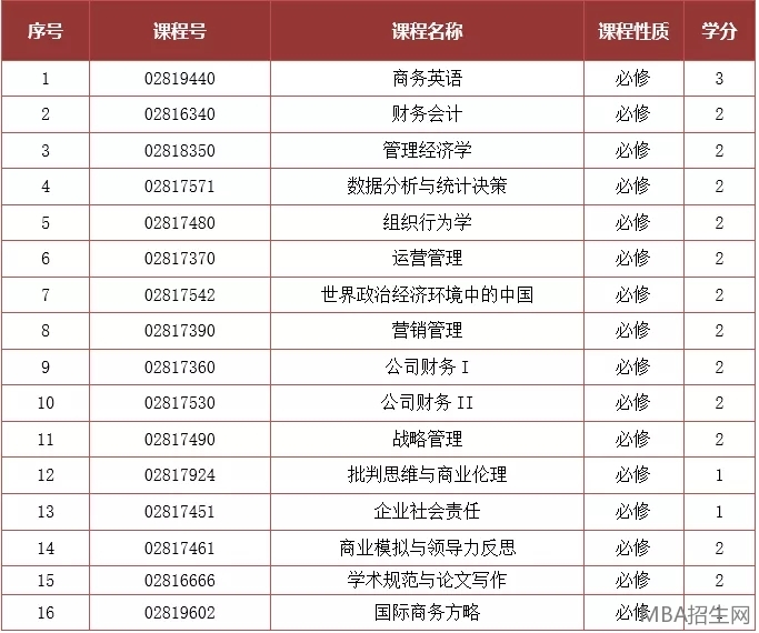 ? 開設(shè)課程:會(huì)計(jì)學(xué)、應(yīng)用統(tǒng)計(jì)學(xué)、規(guī)劃與決策、管理經(jīng)濟(jì)學(xué)、組織行為學(xué)、市場(chǎng)營(yíng)銷、生產(chǎn)與作業(yè)管理、公司財(cái)務(wù)、戰(zhàn)略管理