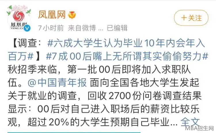 今日,一則新聞登上微博熱搜,六成大學(xué)生認(rèn)為畢業(yè)10年內(nèi)會年入百萬,其調(diào)查結(jié)果顯示,00后對自己進(jìn)入職場后的薪資比較樂觀,超過20%的大學(xué)生預(yù)期自己畢業(yè)后月薪過萬,其中8.20%男生和3.25%女生預(yù)期自己會進(jìn)“5萬元俱樂部”。此外,67.65%大學(xué)生評估自己畢業(yè)10年內(nèi)會年入百萬。