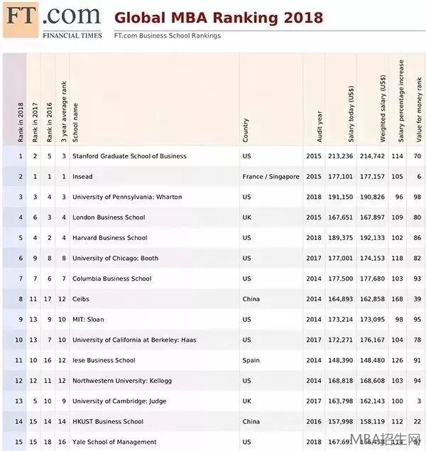 1月29日,英國《金融時報》( Financial Times )發(fā)布“全球MBA百強榜”( Global MBA Ranking 2018 ),斯坦福商學(xué)院、INSEAD、沃頓商學(xué)院摘得前三甲。 進(jìn)入排行榜的中國學(xué)校共有7所,分別為今中歐國際工商學(xué)院、香港科技大學(xué)商學(xué)院、香港大學(xué)、上海交通大學(xué)安泰經(jīng)管學(xué)院、復(fù)旦大學(xué)管理學(xué)院、中國人民大學(xué)商學(xué)院、香港中文大學(xué)商學(xué)院。