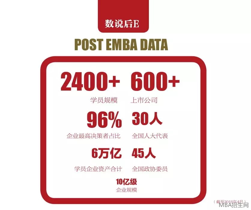 后EMBA商業(yè)領(lǐng)袖項(xiàng)目開辦6年以來,已成為中國企業(yè)家高端知識(shí)學(xué)習(xí)和資源整合平臺(tái)。截止2017年5月,已實(shí)現(xiàn)學(xué)員規(guī)模2100人+,上市公司600+,企業(yè)最高決策者占比96%,學(xué)員企業(yè)資產(chǎn)合計(jì)6萬億,全國政協(xié)委員45人,全國人大代表30人。