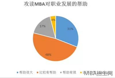 調(diào)查顯示,31%MBA學(xué)員認(rèn)為攻讀MBA對(duì)其職業(yè)發(fā)展幫助很大,48%的學(xué)員認(rèn)為攻讀MBA對(duì)其職業(yè)發(fā)展比較有幫助,僅有17%的學(xué)員認(rèn)為對(duì)其幫助有限。