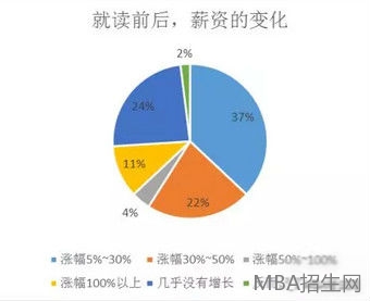 所有被調(diào)查人群中,有37%的人在攻讀MBA后薪酬漲幅在5%~30%之間,22%的人薪酬漲幅在30%~50%之間,同時(shí)也有一定比例的人認(rèn)為攻讀MBA后薪酬幾乎沒(méi)有增長(zhǎng),這部分人數(shù)占比達(dá)24%。也有一小部分人在攻讀MBA后薪酬漲幅在100%以上,占比達(dá)11%;漲幅在50%~100%之間的人數(shù)較少,占比4%