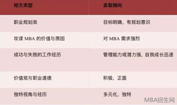 如人大17年申請(qǐng)短文“簡要概述你的短期和長期職業(yè)規(guī)劃,你認(rèn)為人大MBA項(xiàng)目將對(duì)你實(shí)現(xiàn)規(guī)劃產(chǎn)生什么作用”;復(fù)旦19年“如果您被復(fù)旦MBA錄取,請(qǐng)具體談?wù)勀膫€(gè)人學(xué)習(xí)規(guī)劃”;廣東外語外貿(mào)17年“我對(duì)廣外MBA “微笑”(SMILE)價(jià)值觀的理解”;等等。