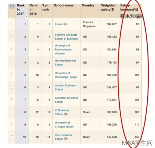我們可以看到排名前十的商學院,畢業(yè)生薪水漲幅都在90%以上,事實上排名前100的商學院,最低的薪水漲幅也在60%以上,而最高的超過150%,有超過50家的畢業(yè)生薪水漲幅都超過100%。